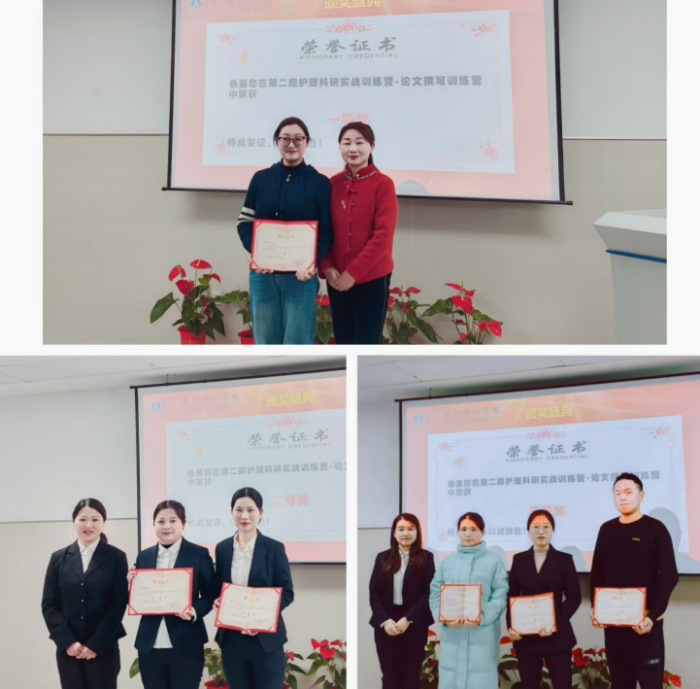 论文撰写实战训练营自今年4月启动,采用导师负责制,以“学员为主、导师为辅、班级依托、小组助推”的全新形式,融合了Seminar式实践教学和“线下教学”等多种教学方法,逐步引导学员在论文选题和撰写的过程中成长与突破。在导师们8次集中训练和悉心指导下,40名学员顺利提交了各自的结营论文。经过9位导师的严格评审,6篇优秀论文脱颖而出,并进行了精彩的现场汇报。护理部主任吴传芳、营长舒玲护士长、副营长吴双护士长为获奖学员颁发了荣誉证书。