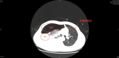CT影像示右侧液气胸,压缩肺组织达到了75%