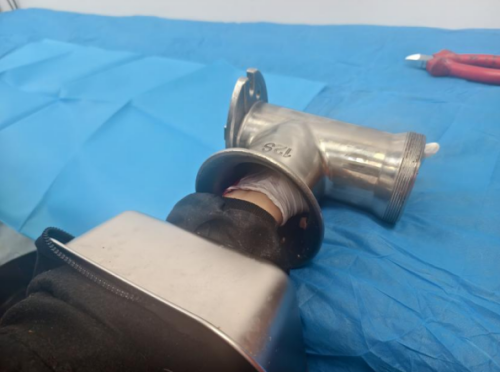 在全麻插管下,消防员经过紧张的操作,终于将手部与绞肉机成功分离,然而取出的右手让在场所有人倒吸一口凉气,李芳右手第1-4指几乎全部被机器绞烂,无法保留手指功能。医生立即行右手清创、第1-4指截指残端修整、组织瓣成形、小指肌腱缝合术,术后生病体征平稳,目前恢复顺利。