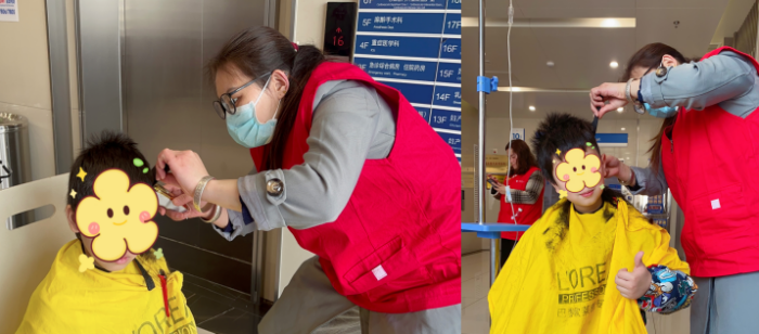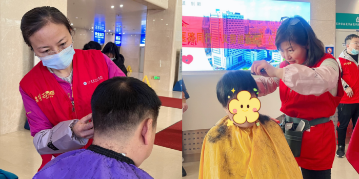 “麻烦帮我把头发剪短一点,方便做事。”上午10:00,儿科医务人员谢洁抽空来到一楼大厅。“平时工作忙,有时忙累了就直接在值班室休息,没太顾得上形象。”10分钟后,她看着自己清爽的样子,笑着说:“龙抬头,剃喜头,谢谢你们!我继续去工作了!”