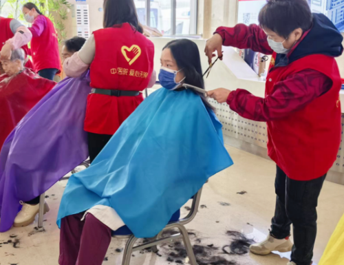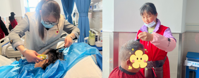 在全科医学科病房,志愿者王小玲正弯腰为陈阿姨(化名)理发。陈阿姨因脑出血留下偏瘫、失语等后遗症,恢复周期比较长,出门不太方便,花白头发已垂到耳际。随着剪刀翻飞,发丝簌簌而落。“真清爽!这头发一剪,人都年轻了!”家人在病床前连连表示感谢。