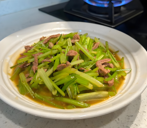 原料:芹菜500克,猪肉200克,花生油15克,食盐3克。