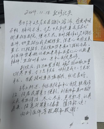的接力救治,救回了我的命。”随即,患者向刘羿杉递上了自己用心书写的感谢信。