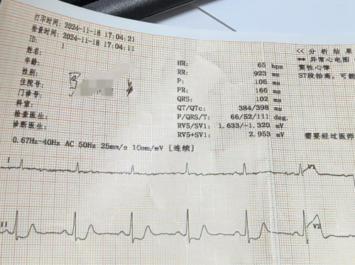 送感谢信的老人名叫罗高强(化名),75岁,2024年11月18日14时,罗高强在湘江冬泳,当天的气温已低至10℃左右。16时,冬泳结束上岸后,罗高强突然感到呼吸受阻,胸口像压了块石头,面对突发的不适,他赶紧来到左家塘街道康达社区卫生服务中心就诊开药。当时,门诊坐诊的医生是立博体育 派驻社区的中西医结合专业副主任医师刘羿杉。得知患者因刚结束的湘江冬泳而感到疲乏、胸闷,想要开些对症的药物。刘羿杉先用听诊器给患者检查,发现患者心律失常。她立刻警觉起来:“不对劲!”并为患者安排心电监护和心电图检查,以及血液检查。结果显示,患者的血压160/100mmHg,指氧饱和度降至92%,心电图显示ST段抬高曲线。并且,验血结果肌钙蛋白、肌红蛋白、肌酸激酶同工酶明显升高,可以判断患者发生了急性心肌梗死。