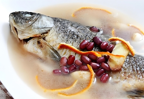锅内放入生姜、花生油,将鲫鱼两面煎至微黄后,加入开水煮10分钟。然后,将鱼和汤转入汤煲,适量加水,放入赤小豆和当归,煲煮40~50分钟,调味即可。