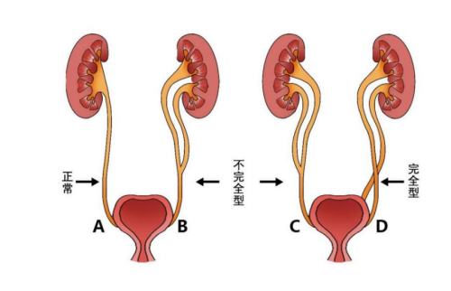 图一:正常输尿管及输尿管畸形不完全型和完全型两种类型的对比图