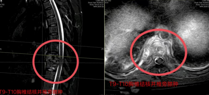 脊柱外科一区副主任医师何友智接诊后,凭借丰富的临床诊察经验,结合检查结果,初步诊断为“胸椎结核(T9、T10)、脊椎结核并椎旁脓肿、肺结核、结核性胸膜炎”。