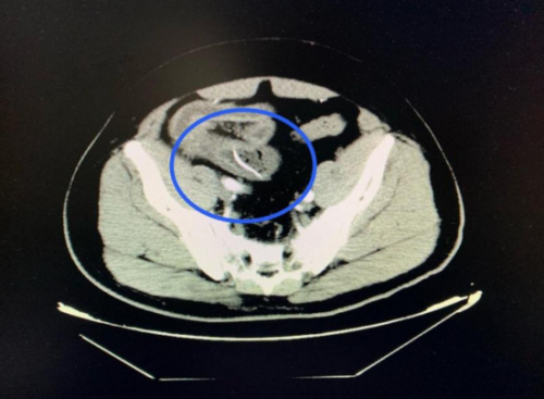 急诊医学科就诊。医生详细询问病情并进行体格检查后,立即安排了腹部 CT 扫描。CT结果显示:回肠高密度影,考虑尖锐异物并小肠穿孔、腹膜炎。结合阳宇军三天前吃甲鱼的经历,医生高度怀疑是误吞甲鱼骨导致了肠穿孔。