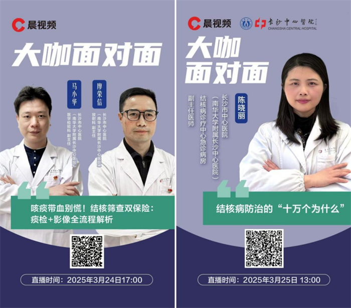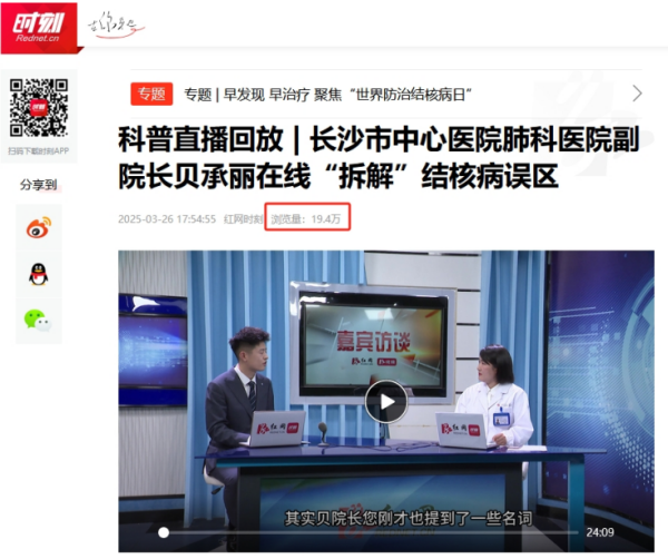 3月24日,立博体育 肺科立博体育 副院长贝承丽受邀参加红网直播,主讲《如何预防结核病?》。同日,医学检验科副主任马小华与放射医学科副主任廖荣信也亮相晨视频“大咖面对面”节目,记者走访检验实验室和放射检查实地,与两位专家共同揭晓结核筛查的关键作用。
