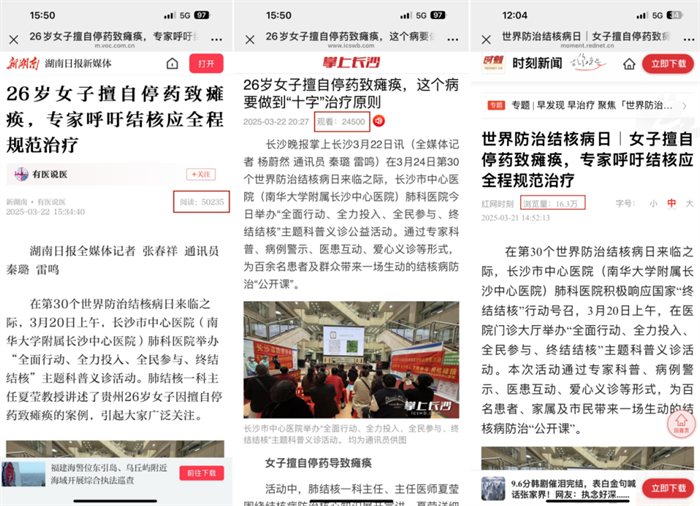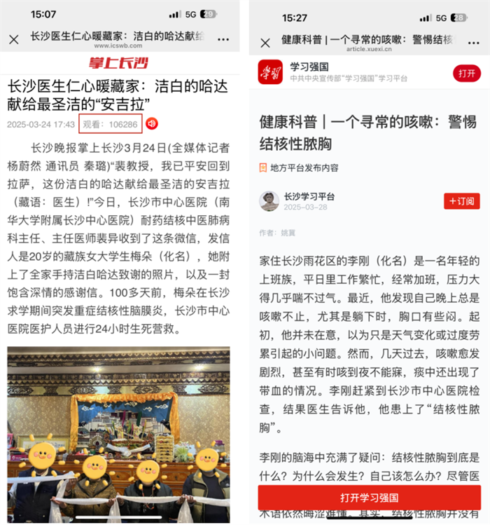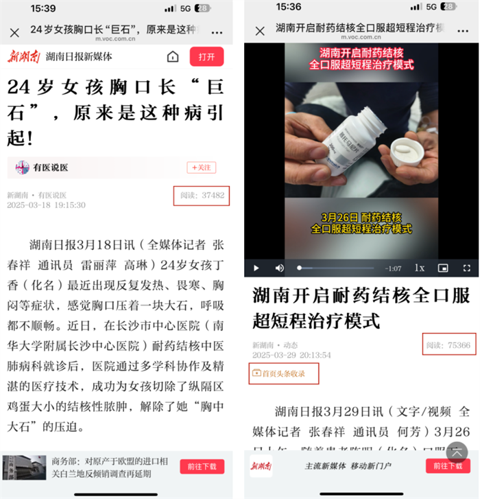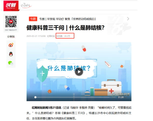 在世界防治结核病日期间,《耐药结核病疗程缩短至6个月!湖南完成新药省内首剂给药》《长沙医生仁心暖藏家:洁白的哈达献给最圣洁的“安吉拉”》及科普视频《拯救“肺”物姜太闲》等多篇结核防治报道,凭借其内容的新颖性、深度与温度,被人民网、中新网、新湖南等10余家媒体争相推送,全网收获近百万流量,有效扩大了结核病防治知识的覆盖面,激发了公众的预防意识,展现了媒体在公共卫生宣传中的积极作用。