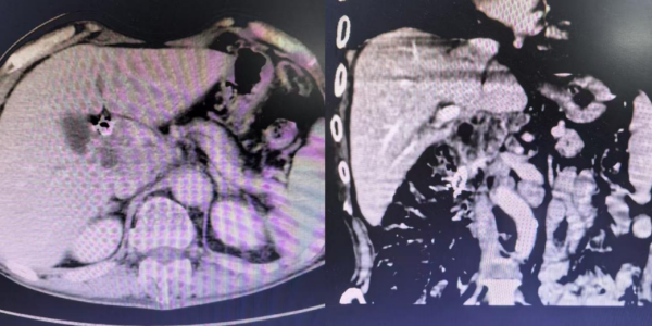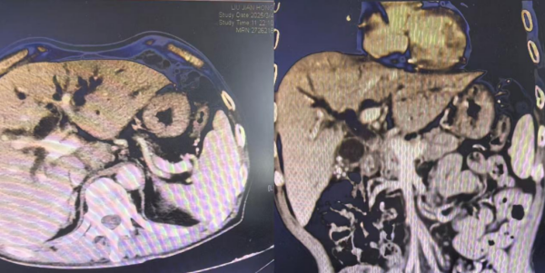 整个手术过程一气呵成,成功开通了梗阻的胆道。手术创口小,患者术后恢复快,全身皮肤及巩膜黄染明显消退,食欲显著好转,精神状态恢复,体重也有所增加,日常生活实现自理。复查CT显示胆道梗阻解除,胆道支架及碘125粒子条位置良好。