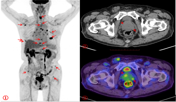 为进一步明确诊断和分期,医生又为李爷爷完善了PSA(全称前列腺特异性抗原,是前列腺癌肿瘤标志物)检测,并安排了18F-PSMA PET/CT检查(PSMA,全称前列腺特异性膜抗原,是一种与前列腺癌密切相关的蛋白质)。最终,PSMA PET/CT显像清晰显示出前列腺癌原发灶及转移灶的范围及大小,并且还发现了FDG PET/CT显像未能查出的微小骨转移灶及盆腔淋巴结转移灶。这一结果为临床医生提供了关键依据,避免了盲目手术或穿刺的风险,为治疗方案选择提供了有力支持。