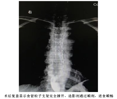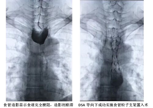 2.支架植入:在数字减影血管造影X线引导下,将支架送至病变部位,球囊扩张狭窄段,食管粒子支架自动膨胀撑开食道。