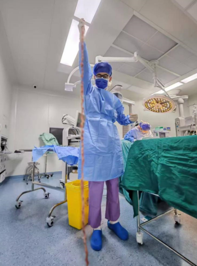 6月3日,在完善相关术前准备后,妇产科三区魏馨主任带领团队为曹女士实施了全麻下单孔腹腔镜子宫肌瘤剥除术。手术过程中,手术人员凭借精湛的技术,通过腔镜下视野,用“削苹果式”逐步减容技术,如同削苹果皮般将瘤组织分离成一条长达2.4米的条索,然后通过腹部2-3公分的切口将肌瘤成功取出。术后,在妇产科医护团队的精心护理下,曹女士恢复良好,5天后康复出院。