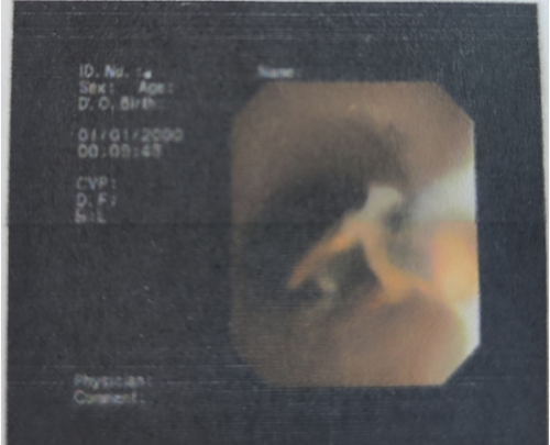 全科医学科主任、主任医师肖智权接诊后仔细查看了王瑛的病历资料,完善肺部CT后显示其右下肺大片状阴影,建议该患者做纤维支气管镜检查。检查过程中,发现患者右肺下叶基底支有异物嵌顿,异物周围因滞留时间长已出现肉芽增生及大量脓性分泌物。内镜医师凭借经验和技术,操作纤维支气管镜的活检钳,将嵌顿的异物从患者右肺下叶基底支处完整取出,医生发现取出的异物竟然是一段辣椒尖。