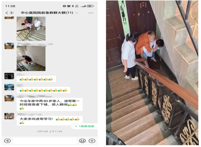 院前急救微信群里,刚刚出车回来的蔡莹医生在群里上传了两张急救车司机“波哥”背着八旬老人下楼的照片,同事们看了纷纷为波哥点赞。除此之外,当天波哥还把一位体重超过自己30多斤、全身水肿严重的尿毒症患者从5楼背到急救车上,而他自己患有腰椎间盘突出多年,痛得厉害的时候只能戴着腰托上班,他说“这份职业就是这样,同事们和我一样,遇到特殊情况就会背起病人,争分夺秒赶时间。”