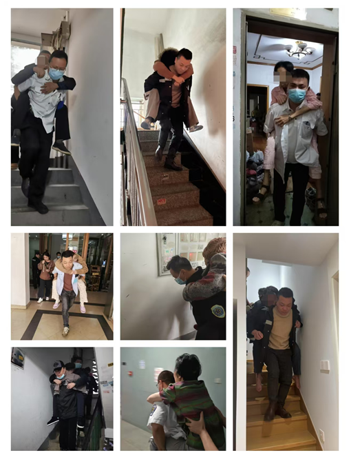 “‘我来背!’是我们出车时经常说的一句话,没有多余言语,我们的医生或是司机总是躬下身熟练地蹲在病人身前,让病人靠稳在他们的背上。一步步地,吃力却平稳地从楼上往下走,而他们的背后,是小心翼翼托举病人的同事,谁都不说累,也没人抱怨一句。”同事蔡莹医生这样说。