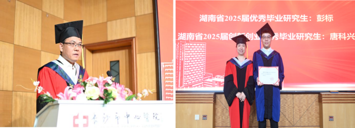 随后,副院长赵飞骏教授宣读了2025届毕业生名单。在全体与会者的瞩目下,到会的院领导及学位评定分委员会委员们庄重地为毕业生们拨正学位帽流苏、颁发学位证书和毕业证书,定格下这人生中意义非凡的荣耀瞬间。党委书记邓平教授、院长陈智毅教授等院领导还分别为荣获湖南省2025届创新创业优秀毕业研究生、湖南省2025届优秀毕业研究生、南华大学2025届优秀毕业研究生称号的同学颁奖,号召全体同仁和研究生学子向榜样学习,追求卓越。