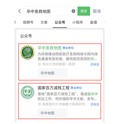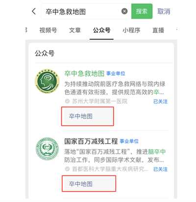 1、微信搜索“卒中急救地图”公众号