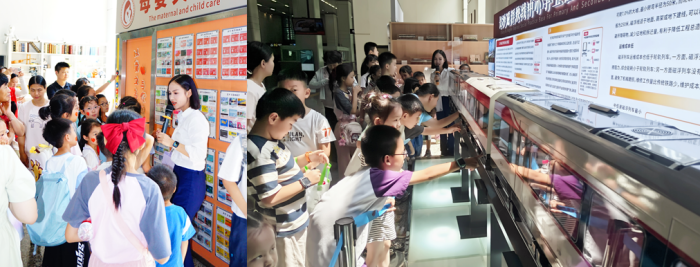 随后,亲子家庭在讲解员和志愿者的带领下参观磁浮列车展厅,在书香驿站翻阅喜爱的书籍、在全国地铁模型展示区驻足观摩、“轨道交通迷”们在环球票卡墙打卡拍照。