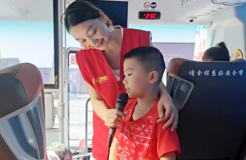 亲子家庭集合,大巴车变身“移动课堂”,个性自我介绍、歌曲接龙等互动游戏迅速点燃气氛。