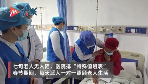 血液内科病房内却暖意洋洋。孤身一人住院的刘向春(化名)老人收到了一份特别的小年礼物——《党员志愿者春节帮扶表》,从1月30日至2月7日过年期间,科室每天都安排了一位党员志愿者陪伴老人,为她生活及功能康复锻炼提供一对一的帮助。除此之外,医务人员还向科内所有患者送上节日的祝福和牛奶、蛋糕等营养品。