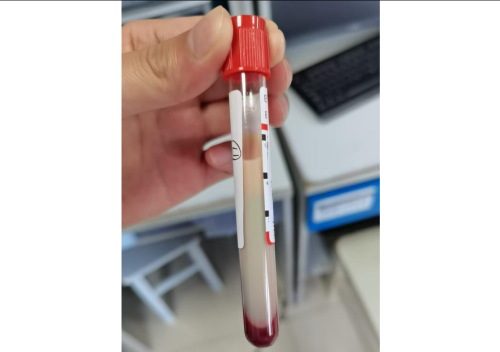 “患者平时饮食习惯很不好,酷爱火锅、烧烤,几乎不吃新鲜蔬果,且缺乏运动,也从未体检,根本不知道自己血脂很高,这次入院前和朋友吃夜宵,大量饮用啤酒,还吃了不少海鲜、烧烤,这些因素如同导火索,最终点燃了其体内早已蓄势待发的‘高脂血症’炸弹。”据该院消化内科副主任、主任医师易艳容介绍,患者的血液检查结果令人震惊——甘油三酯高达74.1mmol/L(正常值<1.7mmol/L),高出正常值43倍多,抽出的血液几乎变成了白色,离心后竟呈乳白色“牛奶状”,里面还可以清晰地看到漂浮在血液里的颗粒状物质。出现这种白色乳糜状物质,是因为血液里含有太高的血脂成分。