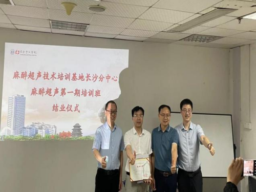 张四海主任在我科研修超声引导下神经阻滞1月余,学习交流了超声引导下多种神经阻滞,顺利完成了培训,以优异的成绩结业。大会上,超声技术长沙分中心负责人刘松华主任跟省人民立博体育 魏来主任,市妇幼高建新主任共同向宁乡县妇幼的张四海主任颁发了麻醉超声技术培训结业证书。